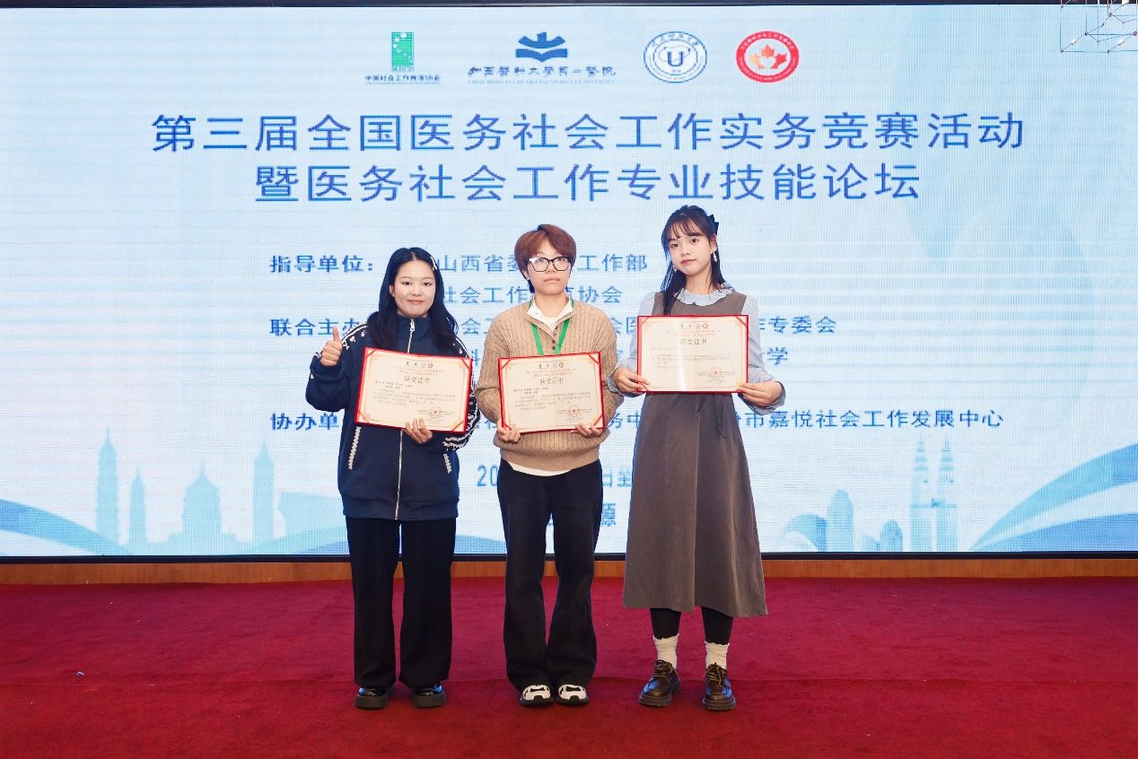 2025年11月9日,第三届全国医务社会工作实务竞赛在山西太原顺利落幕。由我院郭英慧老师指导,社会工作专业研究生组成的参赛团队,凭借作品《游戏治疗取向的小组工作模式在低龄肿瘤患儿医疗恐惧干预中的应用》,在全国158支参赛队伍中脱颖而出,成功晋级全国总决赛并荣获一等奖,展现了我院在社会工作专业人才培养与实务创新方面的突出成效。