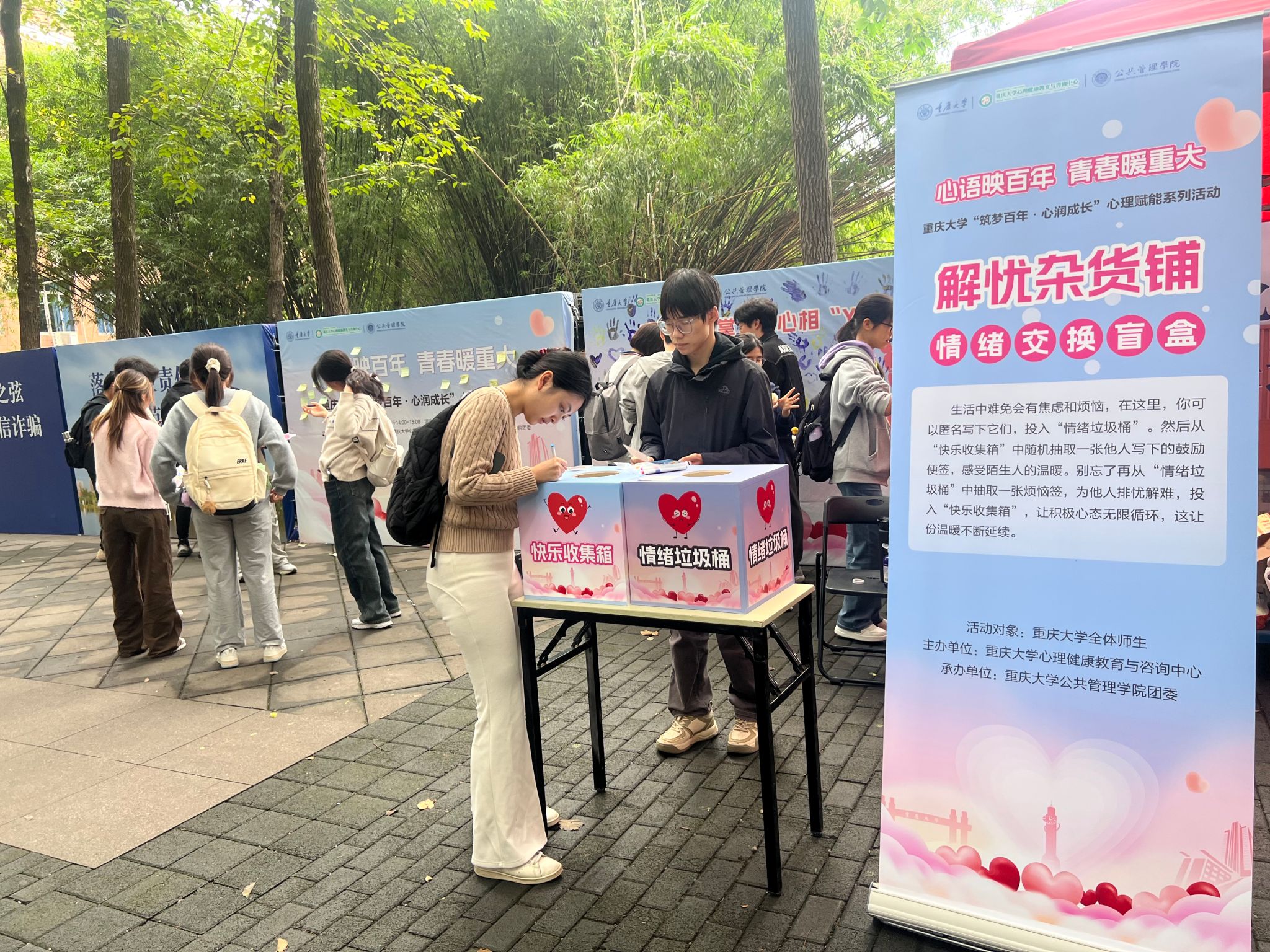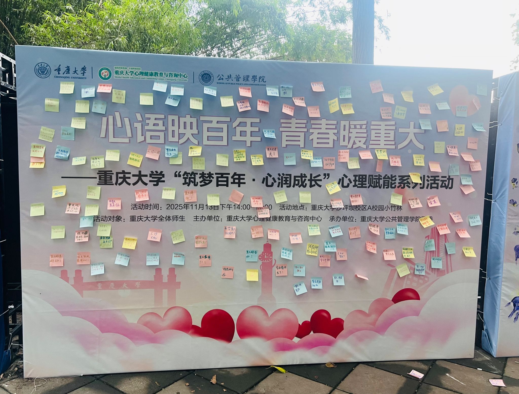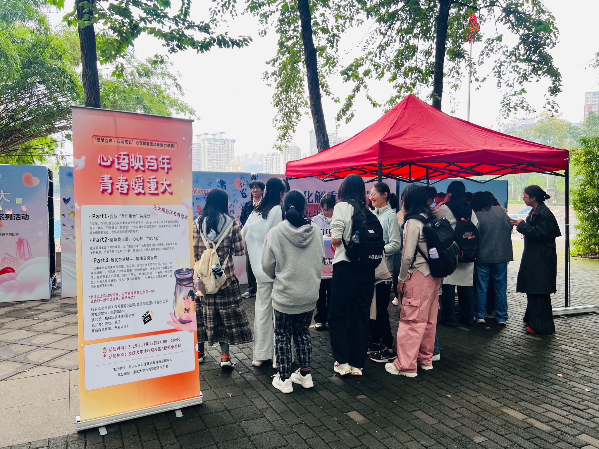 为深入贯彻《全面加强和改进新时代学生心理健康工作专项行动计划(2023—2025年)》要求,充分发挥心理健康教育活动的长效育人机制,营造积极健康、和谐温暖的校园文化氛围,2025年11月13日下午,由重庆大学心理健康教育与咨询中心主办、公共管理学院团委承办的“心语映百年,青春暖重大”心理赋能活动在沙坪坝校区A校园小竹林顺利举行。活动吸引了全校学生的积极参与,反响热烈。