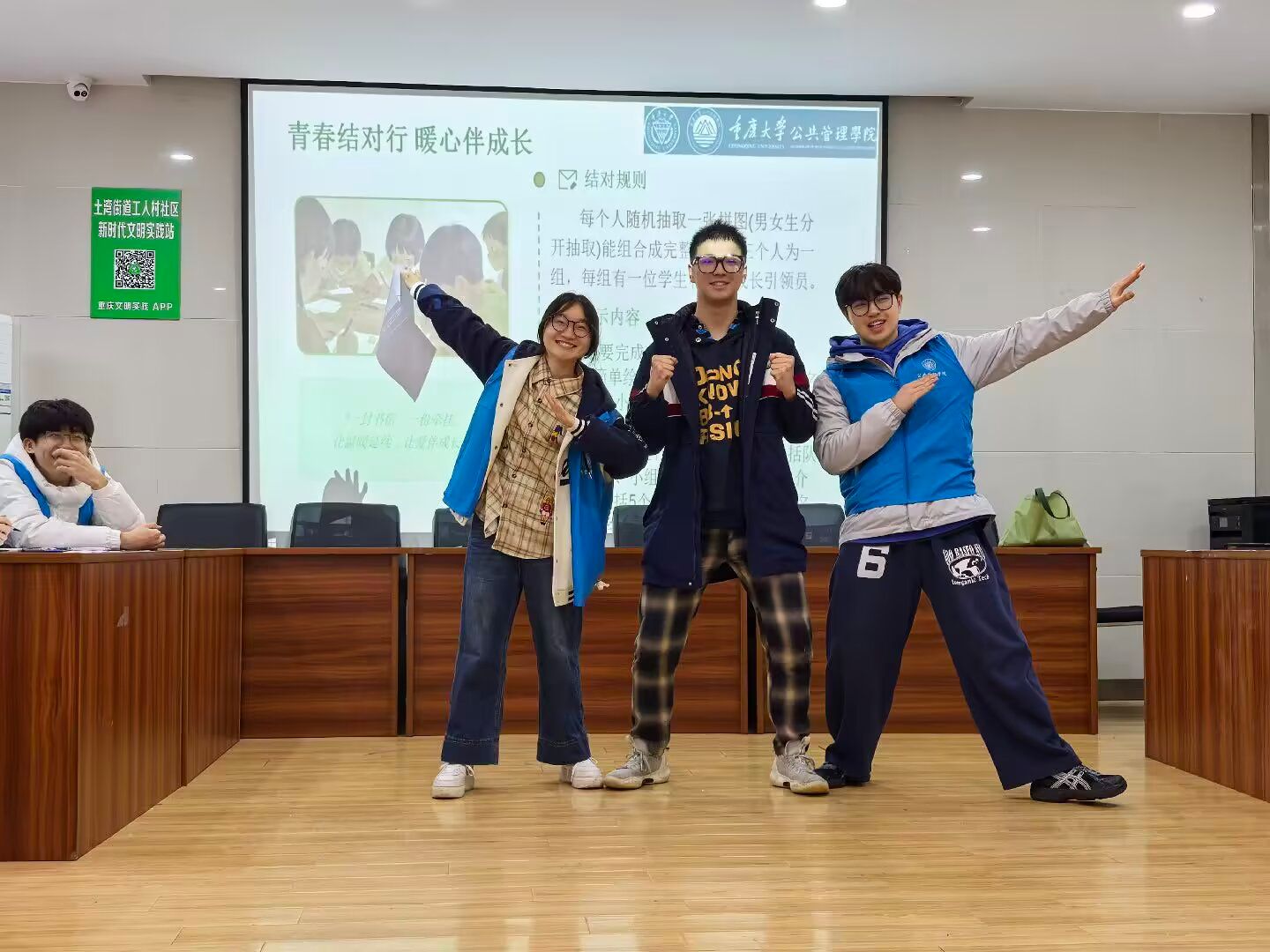 结对仪式是本次活动的核心环节。男女生分开随机抽取拼图碎片,能拼成完整重庆大学标志性建筑图片的三人为一组,每组由一名社区中学生和两名大学生“成长引领员”组成。结对后的小组现场进行共创:绘制小组海报、设计队名与口号、制定成长目标,将青春的期许与自我成长的追求融入其中。小组展示环节精彩纷呈,各组依次登台自我介绍,展示团队风貌,现场掌声不断。