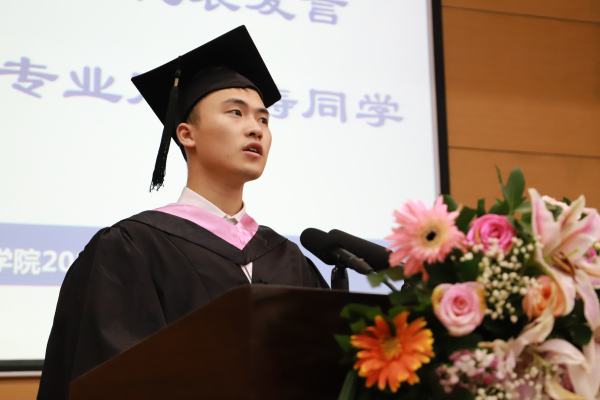 已推免至重庆大学继续攻读硕士研究生的2015级行政管理专业寇桂涛同学作为本科毕业生代表发言。他在发言中回忆了四年来和老师同学们相处的难忘时光,和大家分享了自己在公管学到的可贵品质,希望和大家共勉,在未来的学习工作和生活中,能够勤于钻研、善于合作、勇于创新并且甘于奉献。