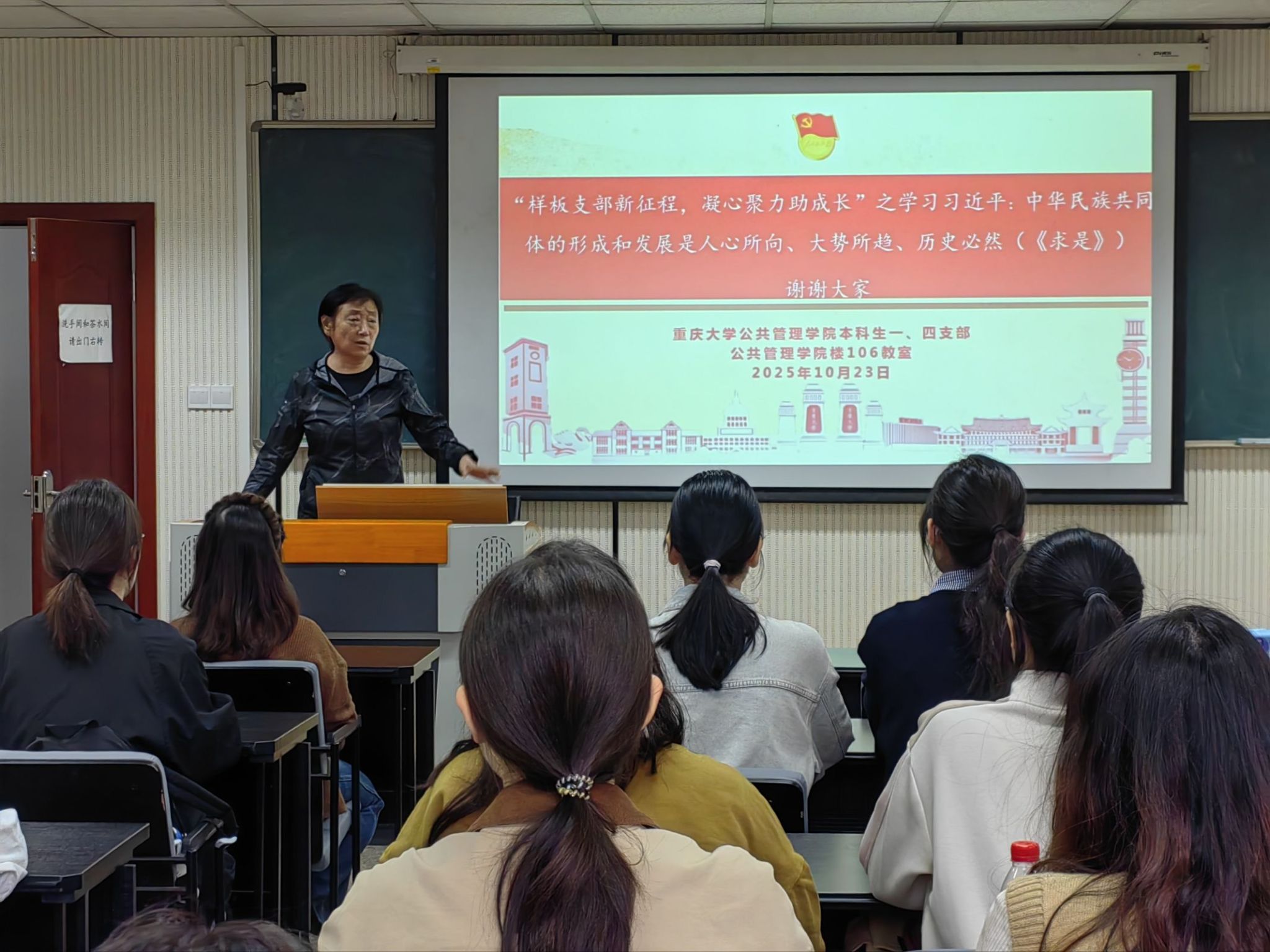 2025年10月23日13时,公共管理学院本科生一、四支部在学院楼106教室举行“样板支部新征程,凝心聚力助成长”之“学习《求是》杂志中习近平总书记的重要文章《中华民族共同体的形成和发展是人心所向、大势所趋、历史必然》”主题党日活动。本次活动旨在通过深入学习该文章精神,铸牢支部党员中华民族共同体意识,深化爱国主义、集体主义、社会主义教育,提升思想觉悟,凝聚各民族共同成长、共促中华民族伟大复兴的精神力量。活动由本科生一支部书记王丽娟支持,本科生一支部党员罗静主讲,一、四支部全体党员、预备党员积极参与。