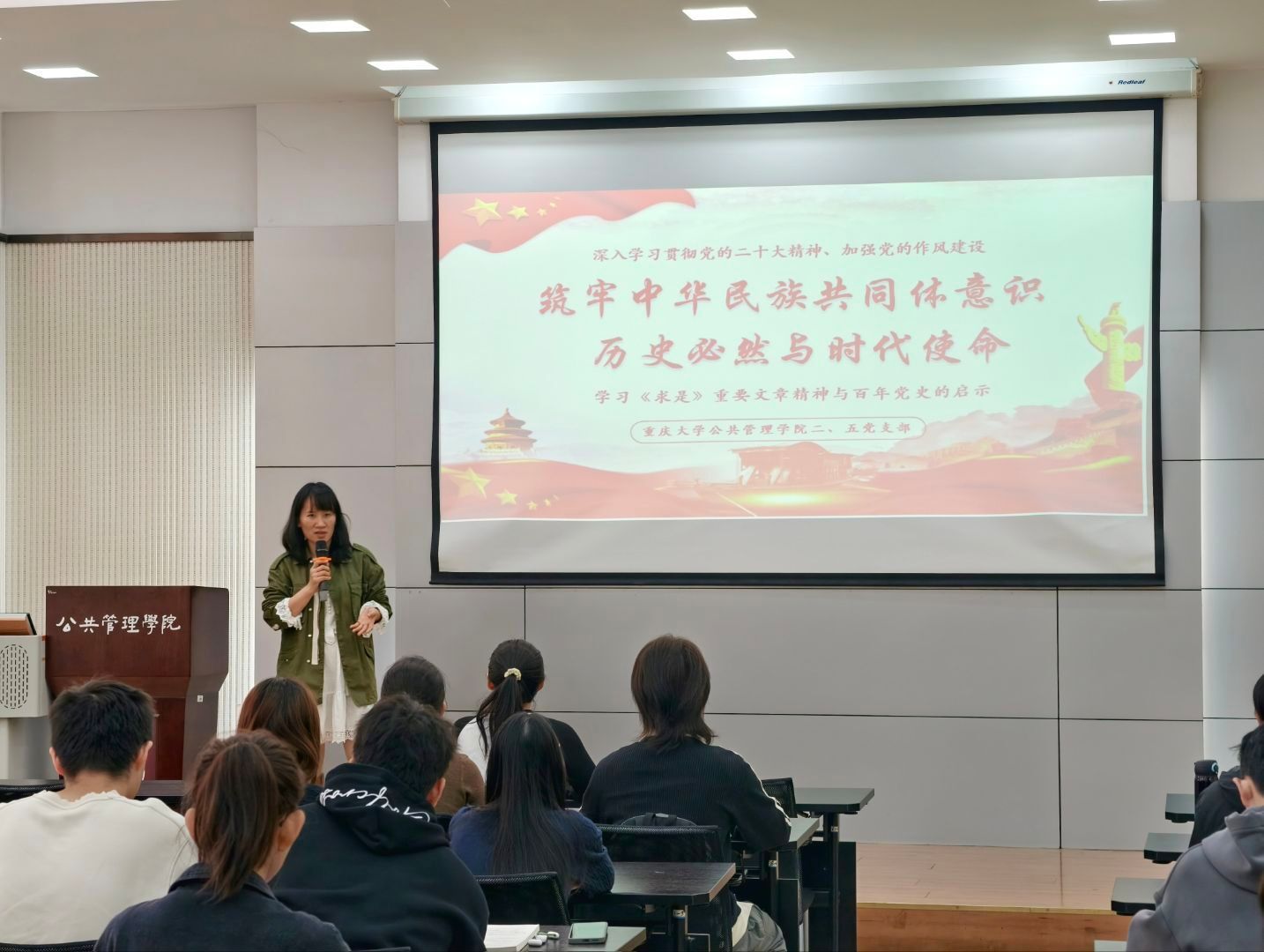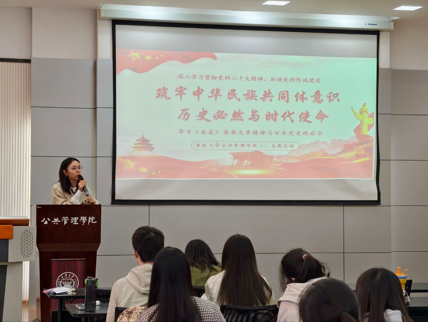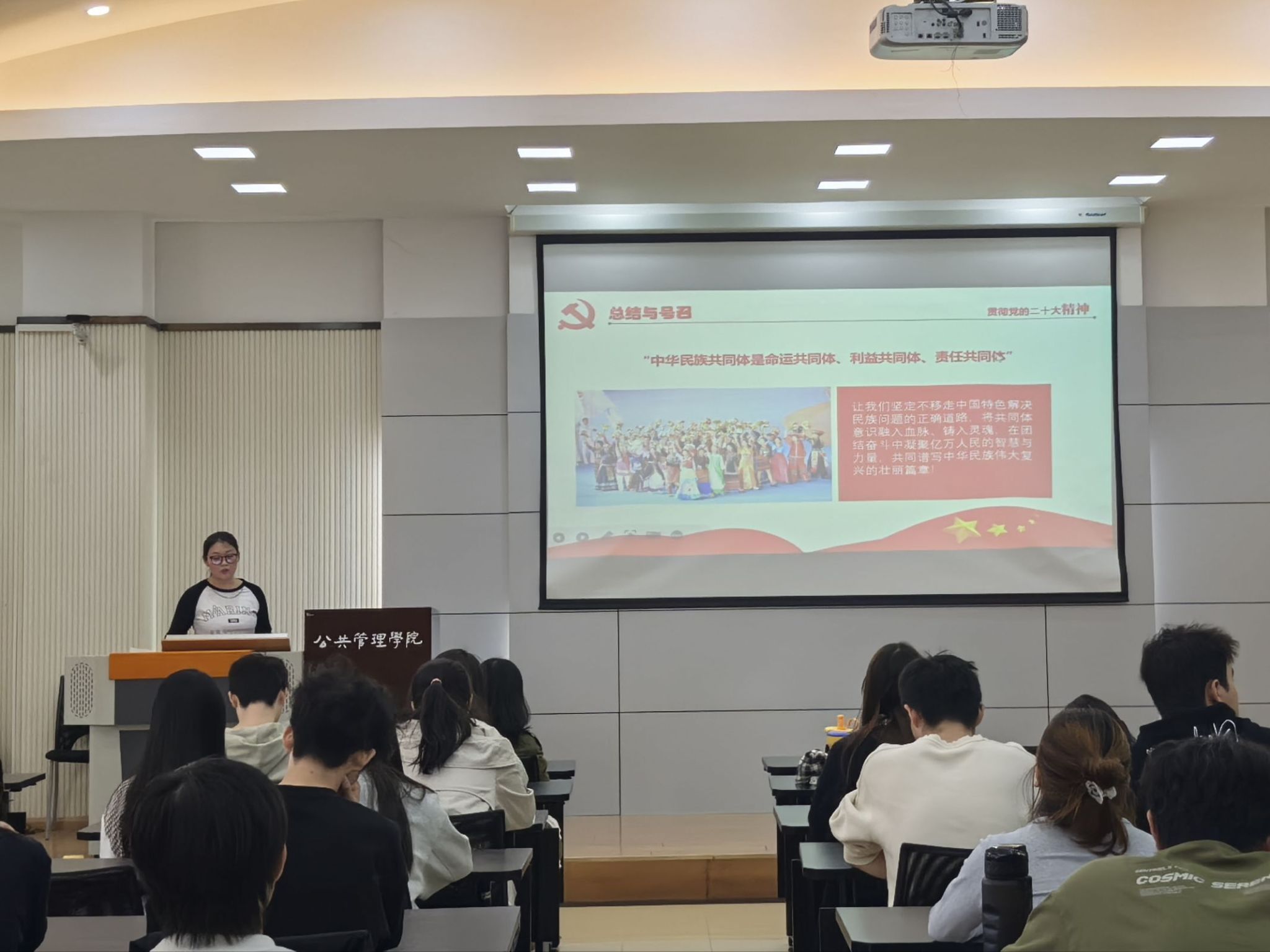 2025年10月23日13时,公共管理学院本科生二、五支部在学院楼102教室联合举办了“筑牢中华民族共同体意识,历史必然与时代使命”主题党日活动。本次活动深入学习习近平总书记在全国民族团结进步表彰大会上的重要讲话精神及《求是》重要文章精神,结合党史历程解读筑牢中华民族共同体意识的重大意义和时代使命。活动由本科生二支部书记徐柳主持,本科生五支部书记曹李思帆以及两个支部的全体党员和入党积极分子到场参加。