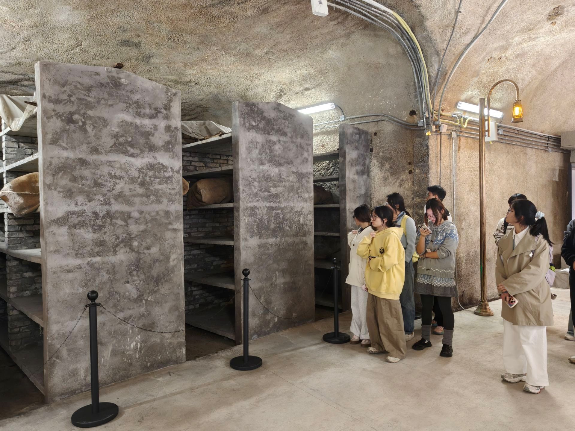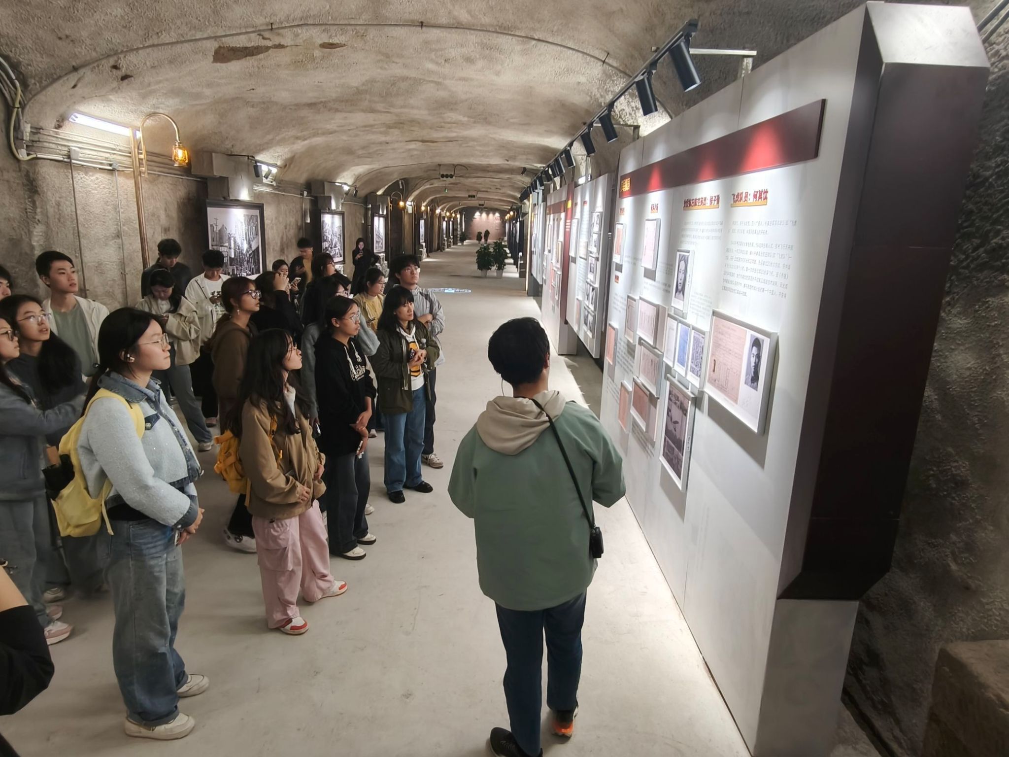 活动伊始,基地讲解员的声音轻轻推开了时光的闸门。随着脚步深入防空洞,潮湿的空气中仿佛还留存着战火年代的印记——泛黄的校史文献、定格着往昔的老照片,每一件实物都在无声诉说着重庆大学的峥嵘岁月。