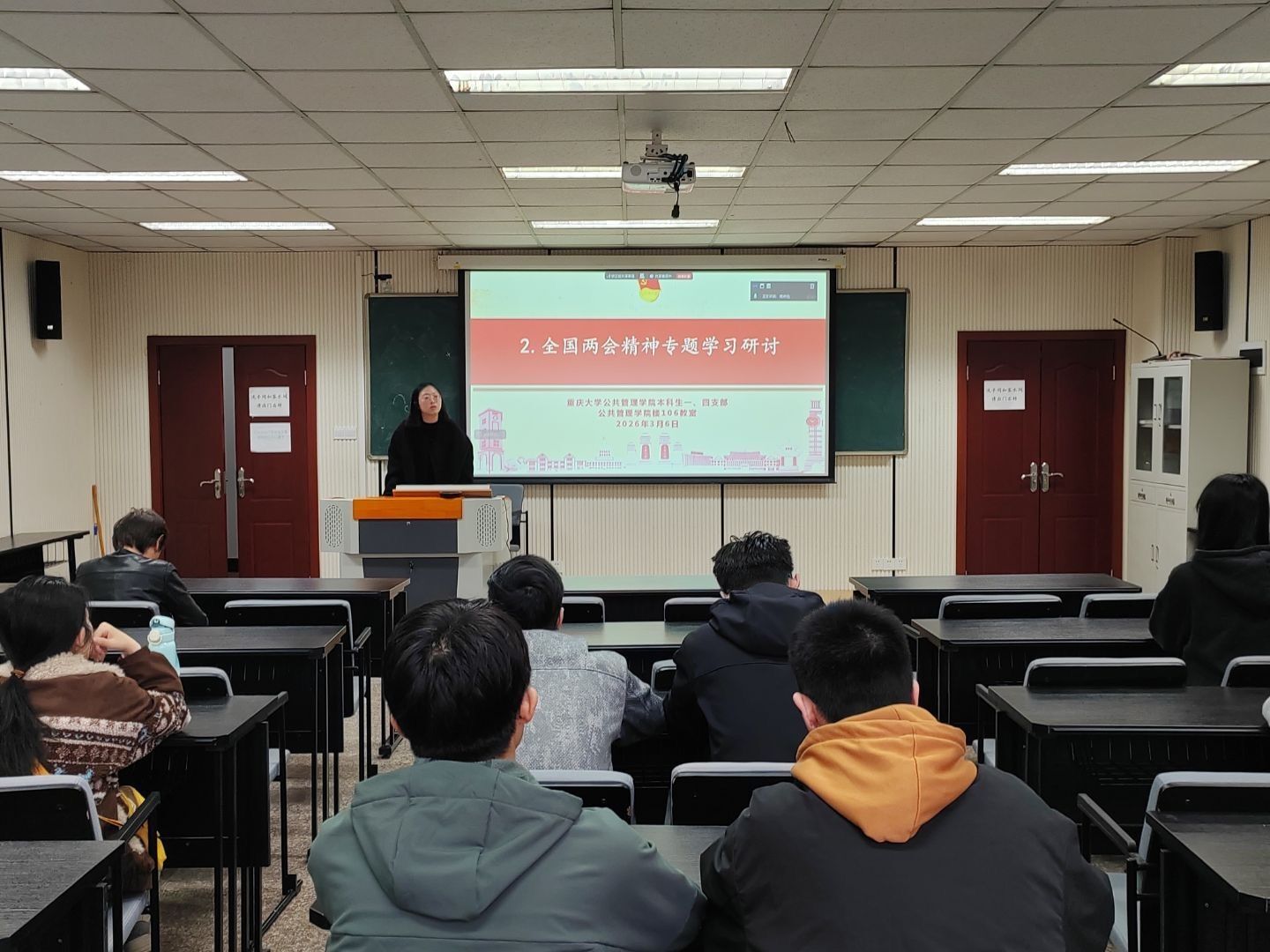 为深入学习贯彻2026年全国两会精神,扎实推进支部思想政治建设,引导青年党员坚定理想信念、勇担时代使命,3月6日上午10时,公共管理学院本科生一、四支部以线上和线下相结合的方式召开党员大会。线下会场设在学院楼106教室,线上同步开启腾讯会议,会议由本科生一支部书记王丽娟、本科生四支部书记钱诗佳共同组织,支部全体党员、预备党员参加学习。
