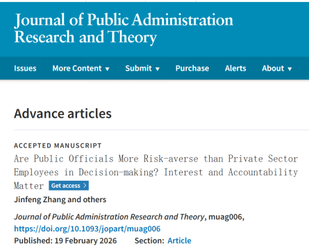 近日,重庆大学公共管理学院张金凤教授作为第一作者和通讯作者的研究成果“Are Public Officials More Risk-averse than Private Sector Employees in Decision-making? Interest and Accountability Matter”在公共管理学科顶尖期刊Journal of Public Administration Research and Theory(JPART)发表。JPART创刊于1991年,是公共管理研究协会(Public Management Research Association, PMRA)旗舰期刊,AJG(ABS)4星,该期刊影响因子在公共管理学科领域常年位列前三,该期刊以审稿严苛、录用率低著称,是公共管理学科五大顶尖期刊之一。该文章主要由张金凤及其指导的2023级硕士研究生宋敏捷(论文第二作者)等人合作完成。该成果是张金凤教授团队在公共决策研究领域的又一重要突破。