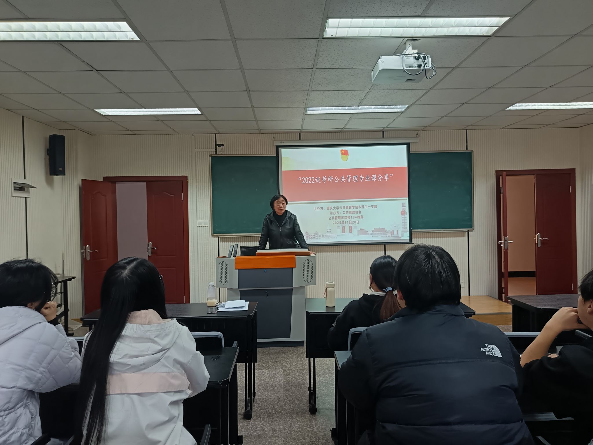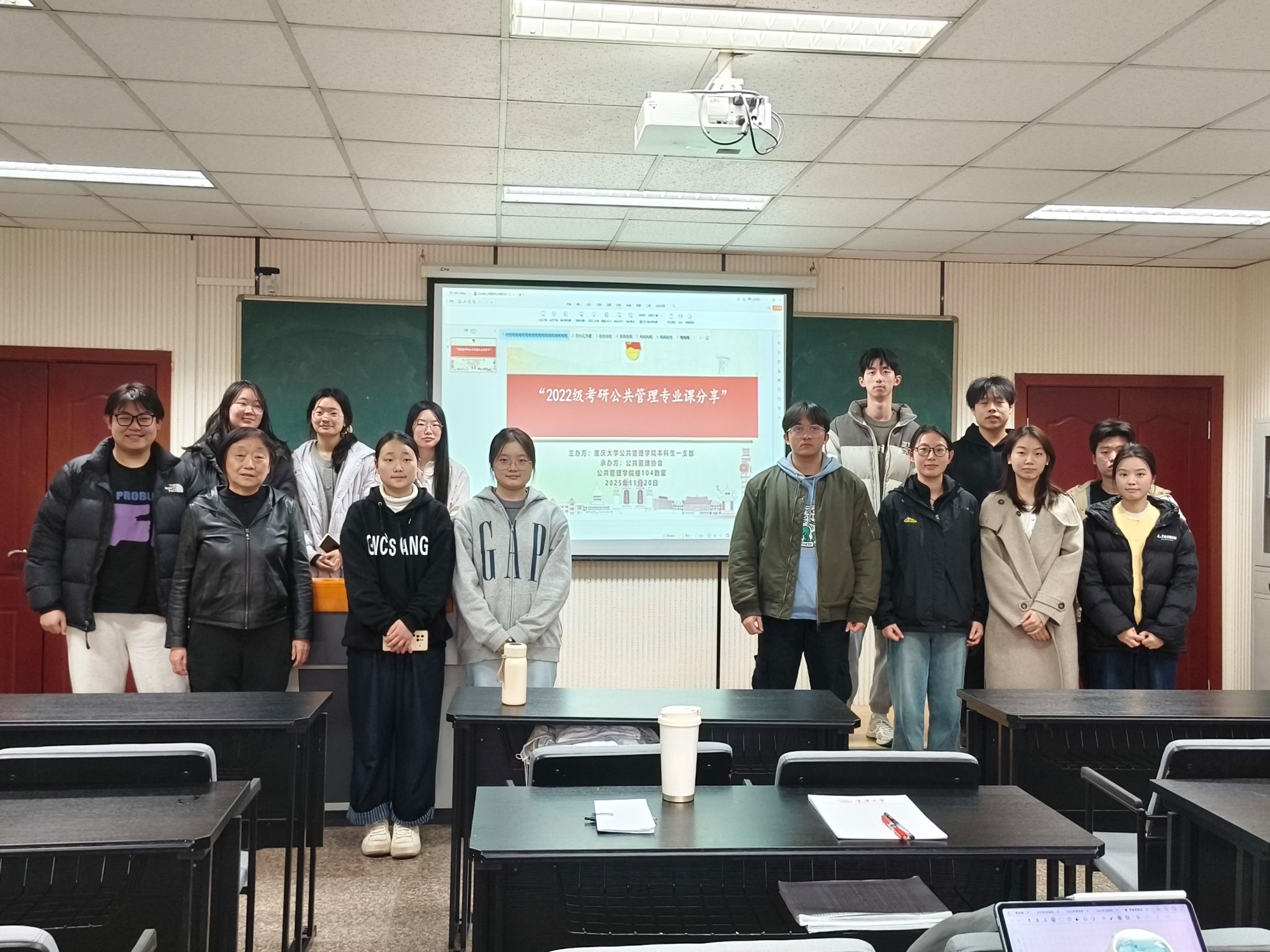 2025年11月20日,由重庆大学公共管理学院本科生一支部主办、公共管理协会承办的“2022级考研公共管理专业课分享会”在公共管理学院楼104教室举办。本次活动旨在践行:“凝心聚力助成长、党建引领办实事”的宗旨,为备考公共管理专业研究生的同学提供实用的学习经验与方法指导,助力同学们科学规划、高效备考,会议由本科生一支部书记、公共管理协会指导老师王丽娟主持,2025级公共管理专业四名经验分享硕士以及报考学生和公共管理协会的部分同学组成。