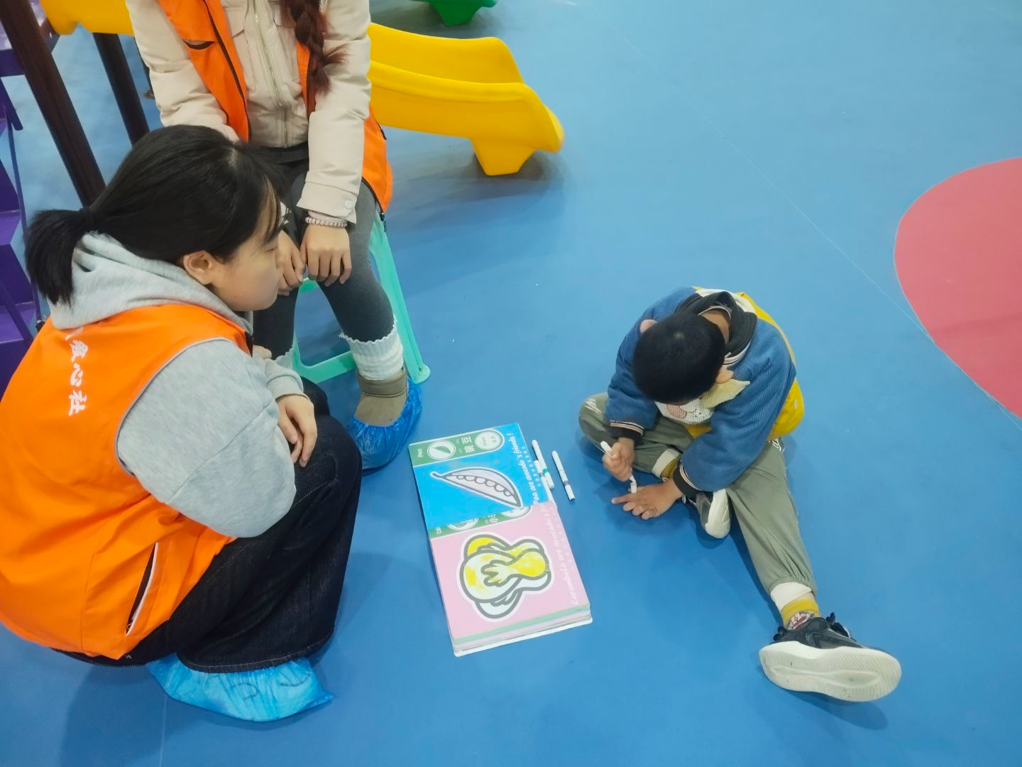 活动过程中,我们实行“两名志愿者对应一位小朋友”的配对模式,让每个孩子都能拥有专属的陪伴与照料。小朋友们的兴趣偏好各不相同:有的拿起画笔,将脑海里的奇思妙想化作笔下的斑斓画面;有的沉浸在积木搭建的乐趣中,拼搭出造型各异的作品,志愿者在旁时刻细心看护;还有的热衷于大堂的游乐设施,志愿者便始终耐心紧随其后,全力筑牢孩子们的安全防线。