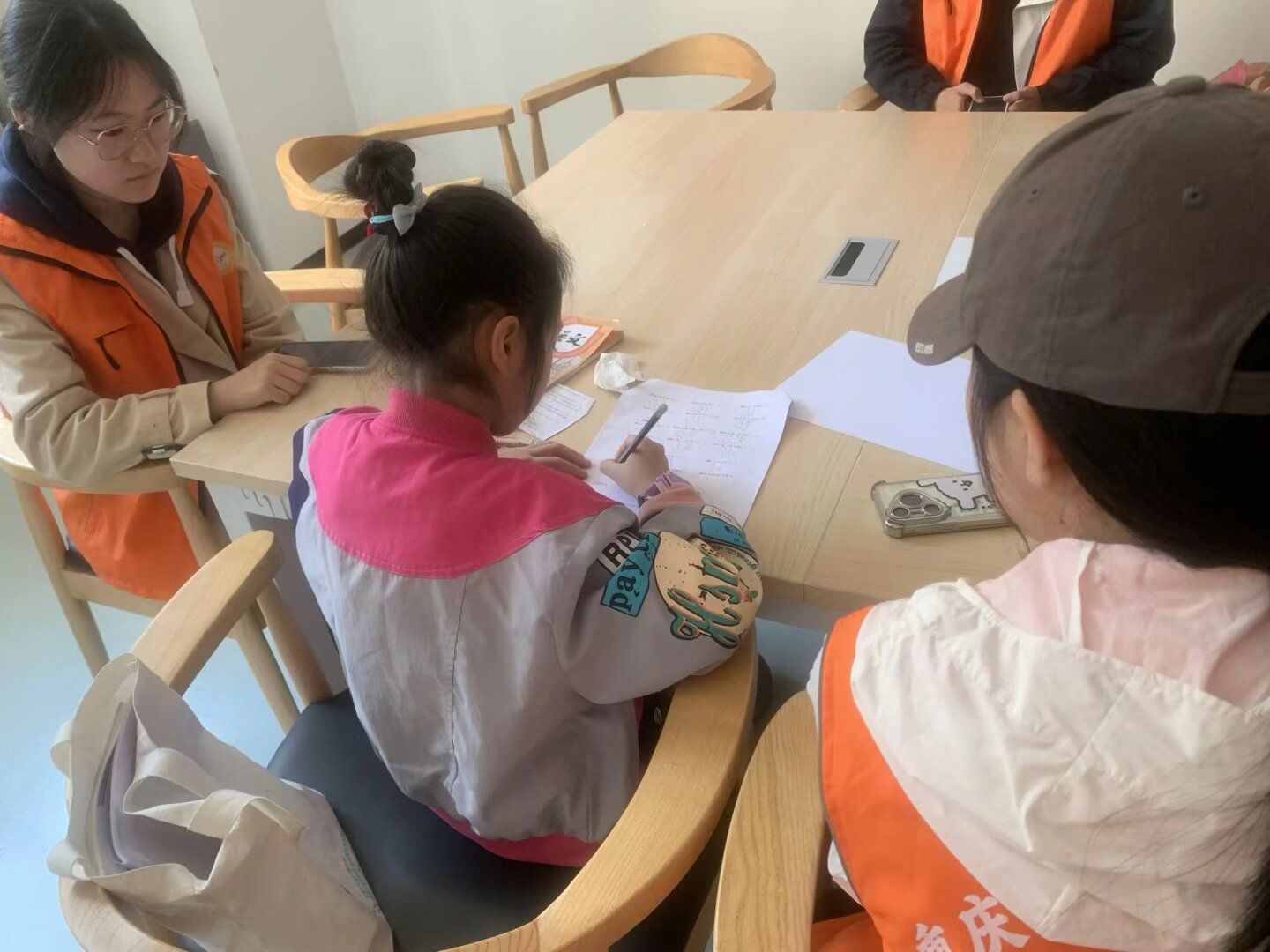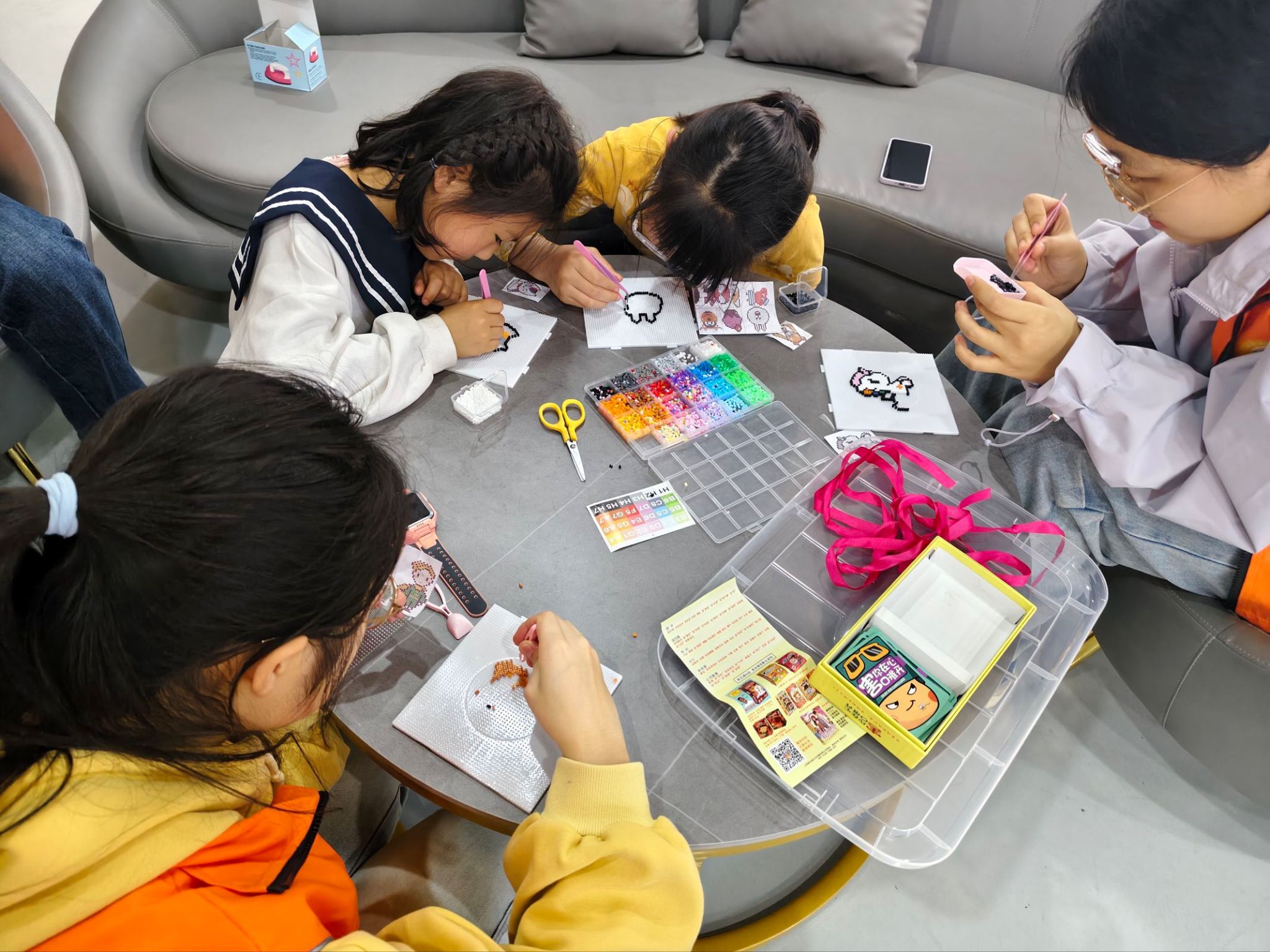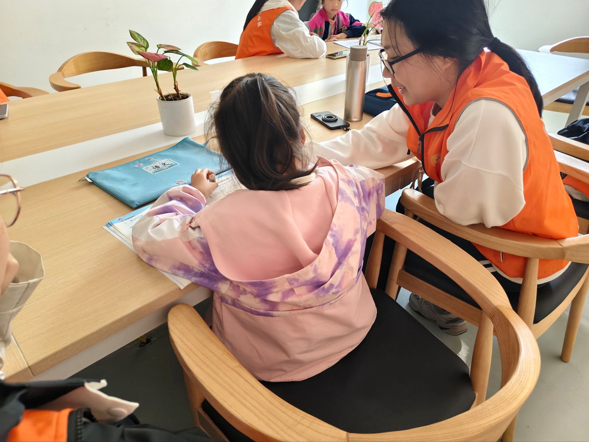 活动现场,志愿者们分工明确、各司其职。部分志愿者负责课业辅导:志愿者们一对一耐心陪伴孩子们完成作业,针对语文、数学等学科的难点问题细致讲解、循循善诱,从知识点梳理到解题思路拆解,用通俗易懂的方式帮孩子们扫清学习障碍,孩子们或低头认真书写,或主动提问,学习氛围浓厚而温馨;部分志愿者负责通过趣味活动培养小朋友们的动手能力:志愿者们带领孩子们开展“拼豆”手工创作等益智活动,孩子们围坐在一起聚精会神地创作,在动手实践中锻炼专注力与创造力。欢声笑语充满了整个活动现场。