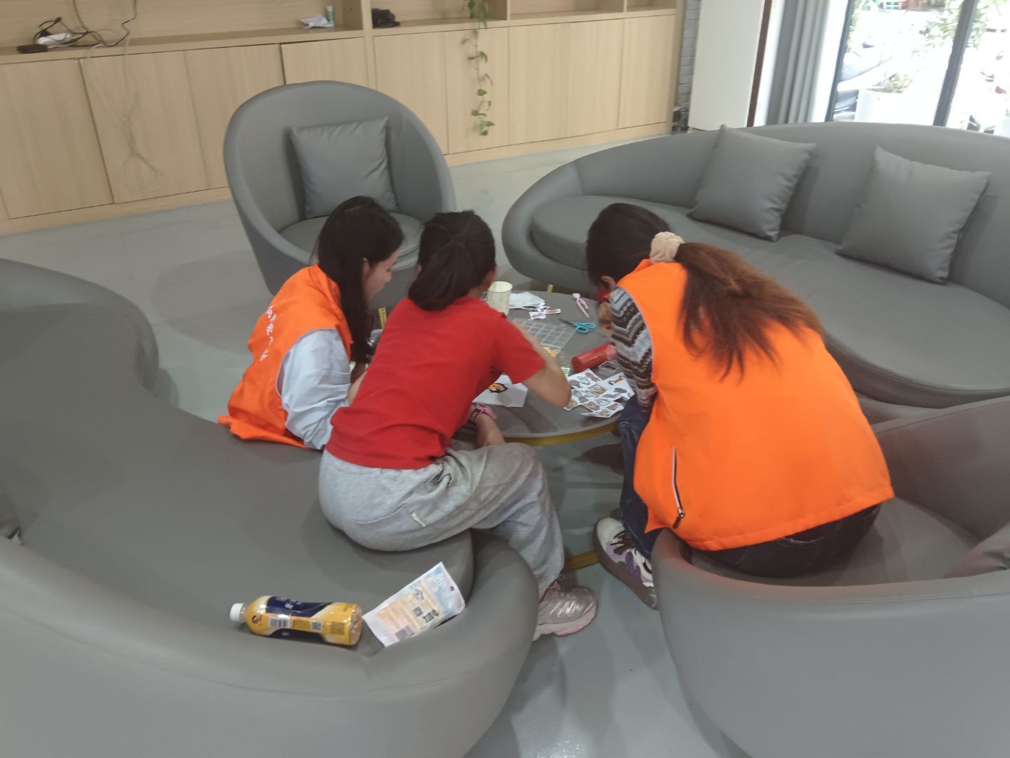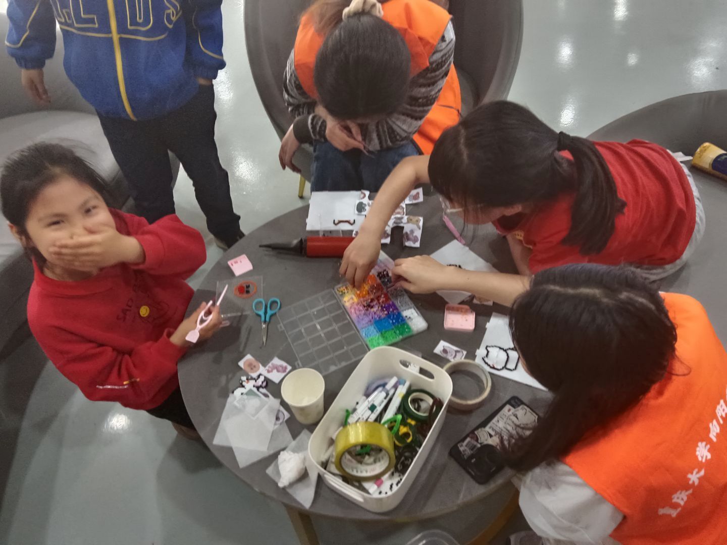 辅导间隙,趣味益智活动精彩上演,志愿者与孩子们围坐在一起,全神贯注地制作手工串珠或钻石画。志愿者耐心地为孩子整理五颜六色的彩色小珠子、胶带、剪刀、印有卡通图案的小纸片和各式文具。