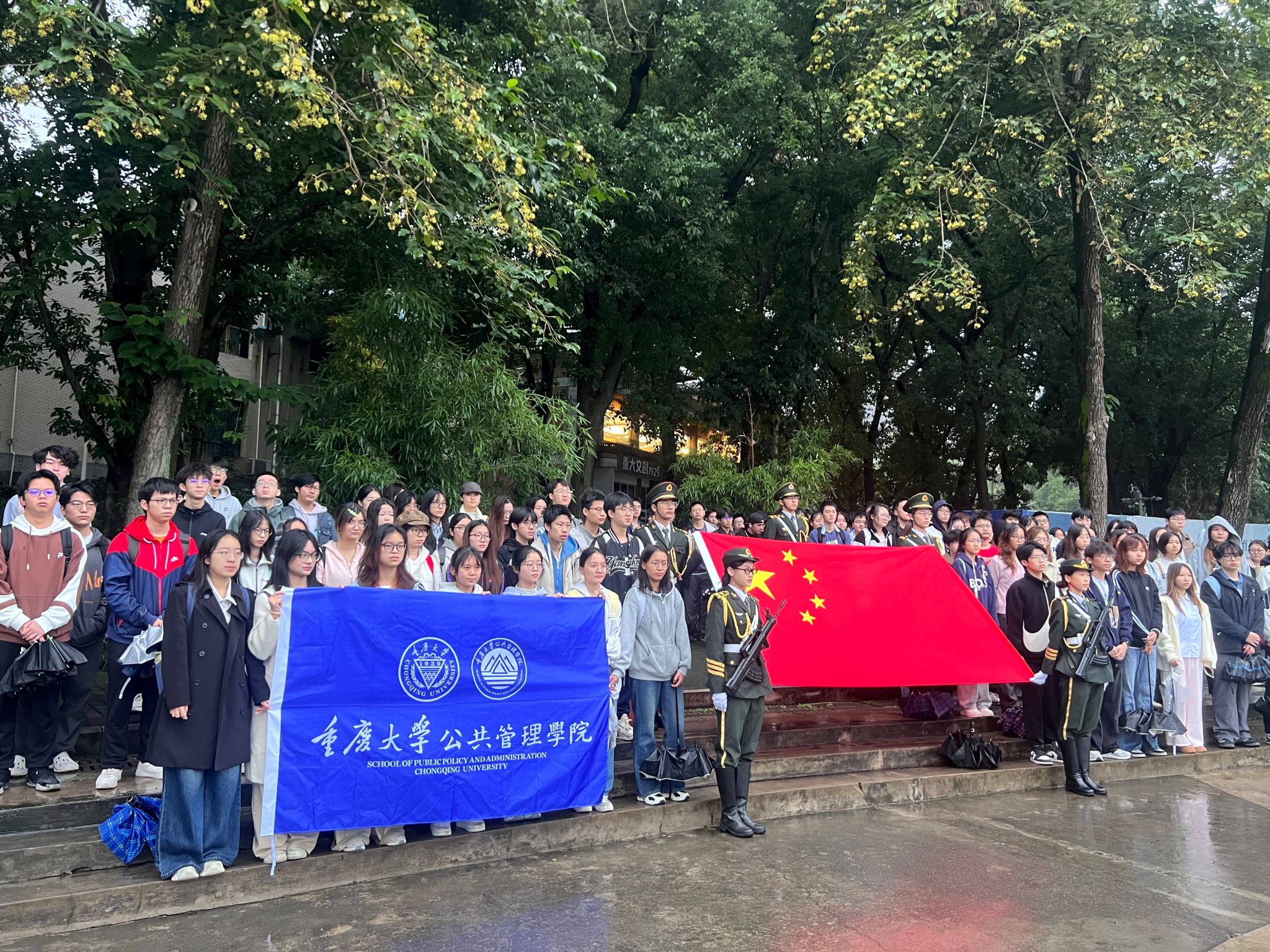 2025年11月10日清晨7时20分,重庆大学公共管理学院本科生二支部、五支部牵头,带领2024级五个团支部全体学生,在A区思群广场庄严开展“升国旗忆峥嵘,守初心勇担当”升旗仪式暨党建带团建主题活动。活动由本科生二支部书记、2024级辅导员徐柳老师统筹组织,全体2024级本科生准时集结,以饱满的精神状态参与此次活动。 初冬清晨,晨光微露,濛濛细雨为活动增添了几分肃穆。全体学生列队整齐、肃立广场,目光聚焦于国旗行进方...
